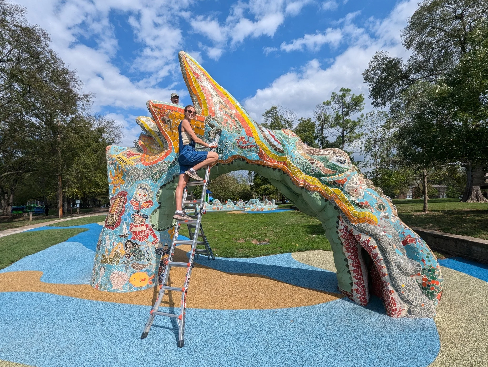 In October 2024, Art Up teamed with Tony Novak to carry out maintenance and restoration on “Two Dragons”, a 150-foot long mosaic sculpture by Pedro Silva at Fannie Mae Dee’s Park (affectionately known as Dragon Park) in Nashville, TN. Two of our team members were trained, by Mr. Novak, on how to perform specific restorative techniques for the sculpture. We will continue to do yearly maintenance and restoration on the Dragons.